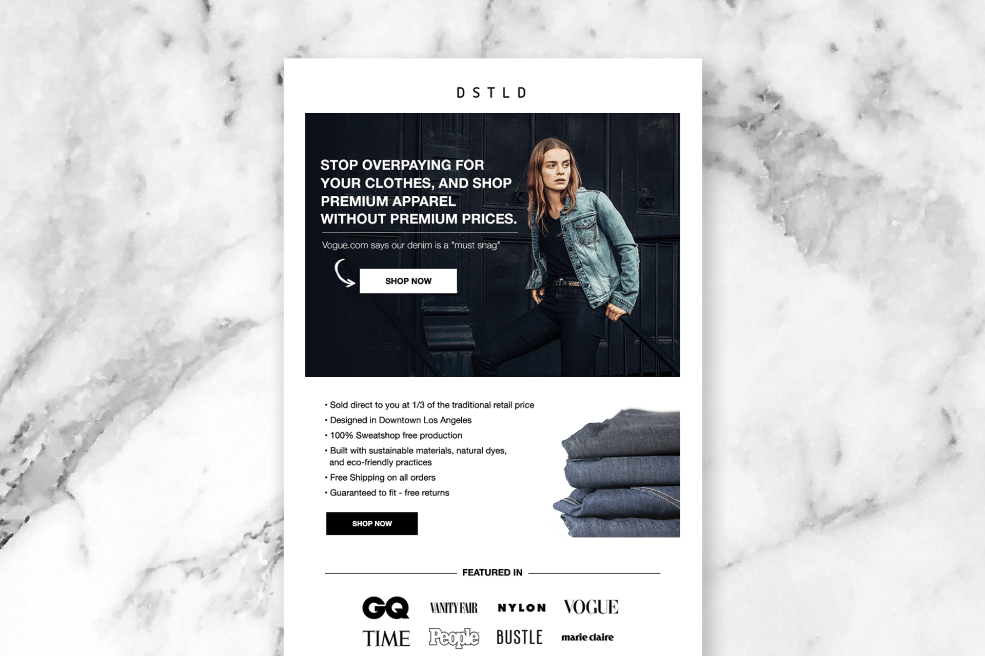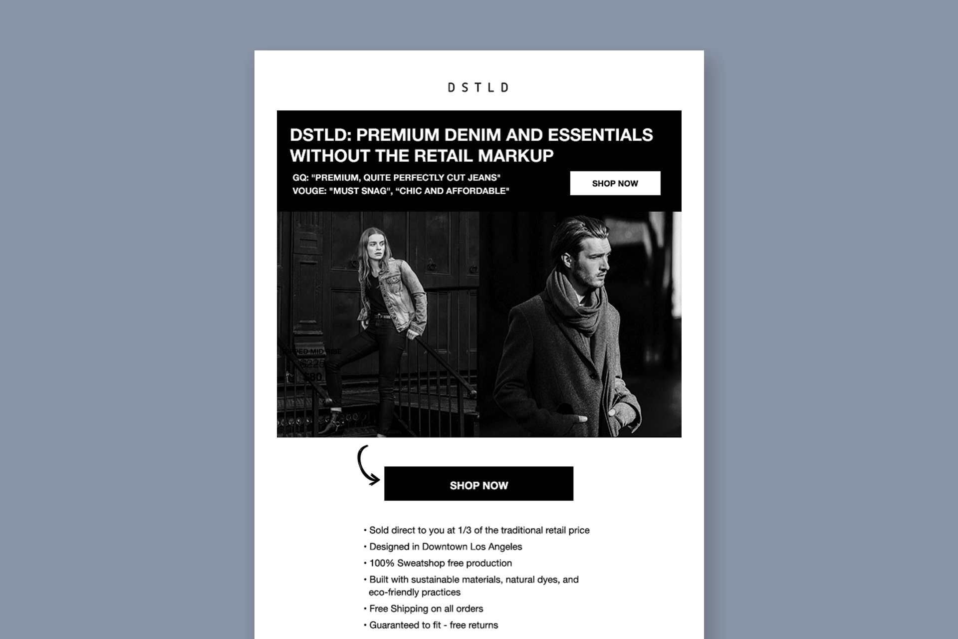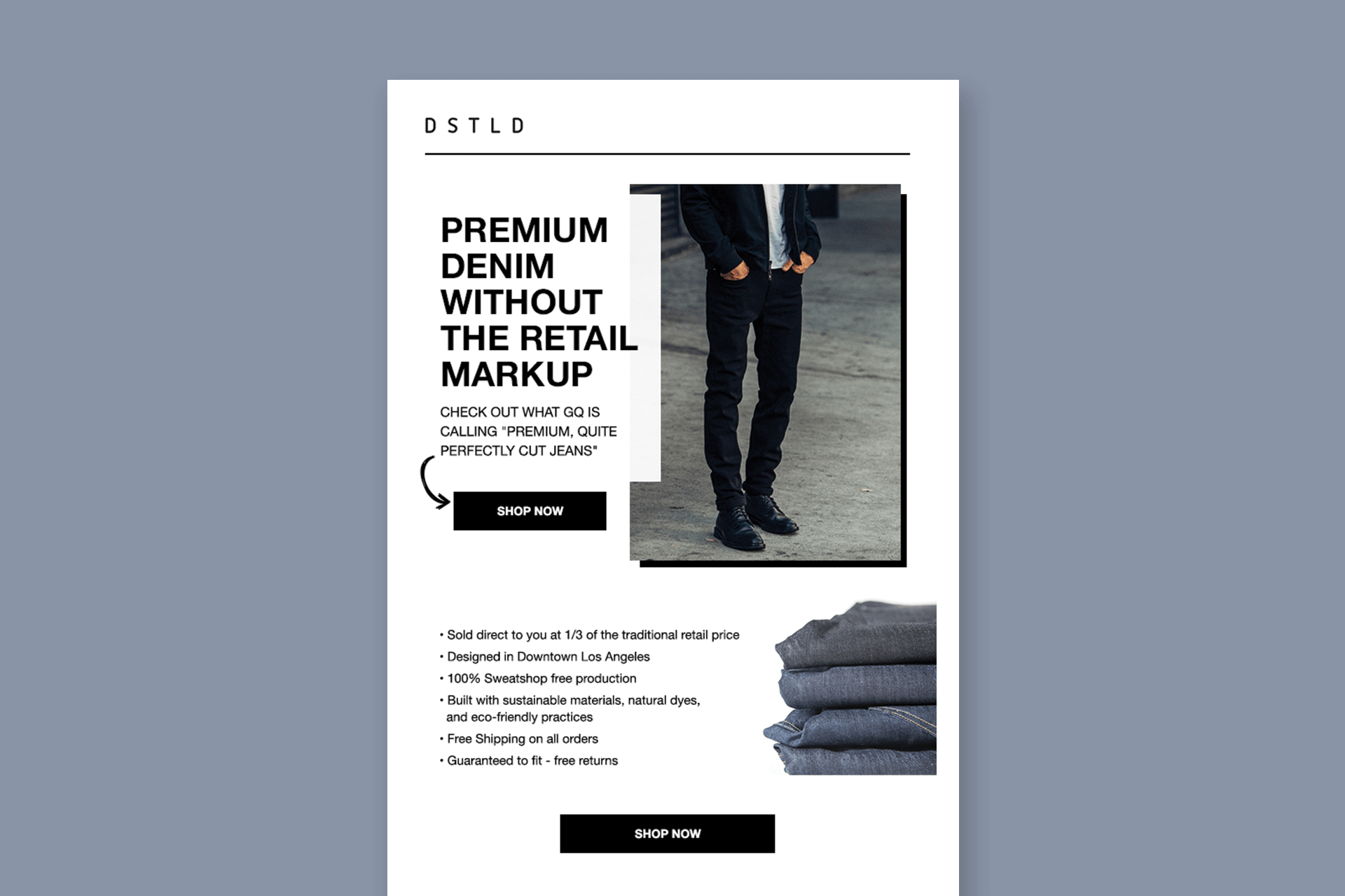 DSTLD has embarked on an innovative journey to reshape the fashion landscape, placing a strong emphasis on eco-friendly materials and sustainable production partners. In this exciting endeavor, I’ve been given the unique opportunity to lead the creative direction for crafting compelling promotional emails that will not only market their premium denim but also tell the story of their commitment to sustainability, style, and quality.